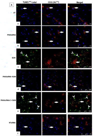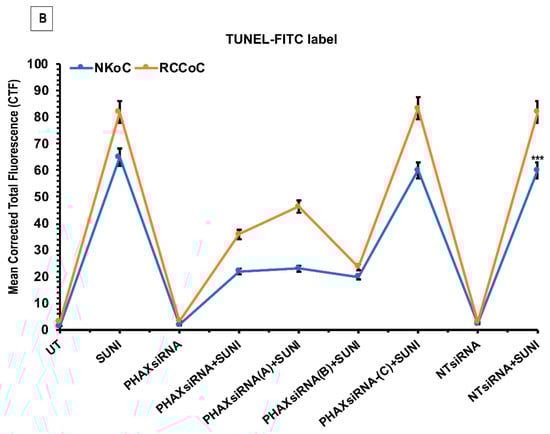 TUNELpositive cells in sections of ccRCC organ cultures subjected to PHAX-siRNA; PHAX-siRNA-A, B, and C; and non-targeting-siRNA (NT-siRNA) prior to treatment with sunitinib (200 µM) for 1 h at 37 °C. (A) Untreated cultures and cultures treated with a cocktail of PHAXsiRNA alone show negligible levels of TUNEL positive cells (arrows) (panels a,b) compared sunitinib-treated cultures, which show increased cell death in some tumour cells (arrowheads) and in CD31positive blood vessel ECs (arrows) (c). In contrast, cultures pre-treated with PHAXsiRNA prior to sunitinib treatment show diminished levels of TUNELpositive cells (d), while cultures pre-treated with PHAXsIRNA-C prior to sunitinib treatment showed a similar pattern to cultures treated with sunitinib-alone (e). Cultures pre-treated with NTsiRNA (negative control) showed a negligible level of staining, similarly to UT cultures (f). Original magnification ×40. (B). Quantification of the percentage of TUNELpositive cells/total number of cells x100 at ×40 magnification. Statistical significant data are presented as means + SEMs. (*** p < 0.0001-UT vs. treated cultures); ns–not significant. One-way ANOVA and Bonferroni post hoc test were used to determine statistical significance. *** p < 0.0001—vs. UT or PHAXsiRNA or NTsiRNA alone-treated cultures, + p < 0.001—vs. sunitinib-treated cultures; ns—not significant. N = 3 per group with similar results.