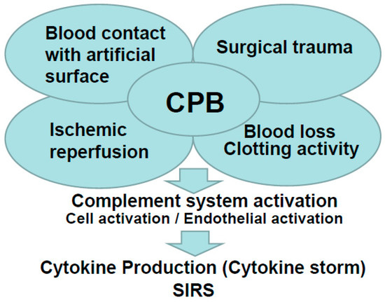 Our recent report showed that CPB leads to a cytokine release and major organ damage in a rat CPB model [24,25,26,27,28]. In this review, we will introduce our study focusing on the inflammatory response in CPB. Figure 1 summarizes the inflammatory response in CPB.