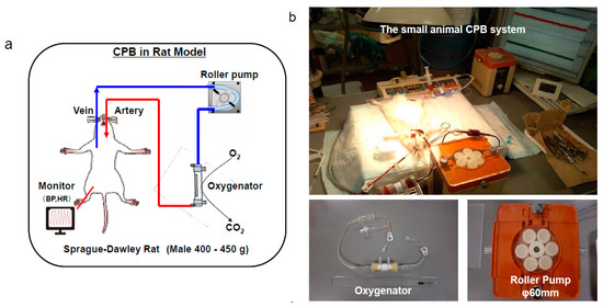 Male Sprague-Dawley rats (400–450 g), 14–16 weeks old, were used. After the animals were anesthetized with 5.0% isoflurane mixed oxygen enriched air inhalation with a vaporizer, they were placed in the supine position, and a rectal temperature probe was then inserted. Following orotracheal intubation using a 14G catheter (Terumo Corp, Tokyo, Japan), the animals were mechanically ventilated under 40% of oxygen fraction with a Model 687 respirator (Harvard Apparatus Ltd., Edenbridge, Kent, UK) providing volume-controlled ventilation at a frequency of 70/min, with tidal volume of 8–10 mL/kg body weight. Isoflurane 2.0–2.5% was used to maintain anesthesia, and the rectal temperature was kept at 35–36 °C. The right femoral artery was cannulated with SP-31 polyethylene tubing (Natsume Seisakusho Co. Ltd., Tokyo, Japan) for arterial blood pressure monitoring using a Power-Lab system (Model ML870, AD Instruments Japan Inc, Nagoya, Japan). SP-55 polyethylene tubing (Natsume Seisakusho Co. Ltd.) was used to cannulate the left common carotid artery as the arterial return cannula for the CPB system, and heparin sodium (500 IU/kg) was given through this cannula. A 16G cannula (Togo-medkit Co. Ltd., Tokyo, Japan) was passed through the right internal jugular vein advanced into the right atrium as the conduit for venous uptake. The CPB system consisted of a roller pump (MP-3, Tokyo Rikakikai Co., Ltd., Tokyo, Japan) a miniature membrane oxygenator (Senko Medical Instrument Mfg. Co., Ltd., Tokyo, Japan), and polyvinyl chloride tubing line (Senko Medical Instrument Mfg. Co., Ltd.). CPB circuit was primed by 3 mL of sodium bicarbonate, 3 mL of mannitol, 8 mL of Ringer’s solution, and 1 mL (1000 IU) of heparin. Animals in which the hemoglobin level declined to less than 7 g/dl at any point were excluded from the study. Figure 2a,b shows the rat CPB model.