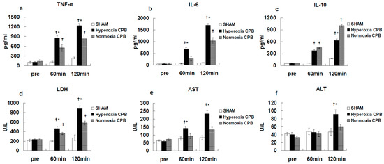 Plasma levels of tumor necrosis factor (TNF)-α (a), interleukin (IL)-6 (b), IL-10 (c), lactate dehydrogenase (LDH) (d), aspartate aminotransferase (AST) (e), alanine aminotransferase (ALT) (f) [25]. † p < 0.05 versus the SHAM group, * p < 0.05 versus the Normoxia CPB group at the same point in time.