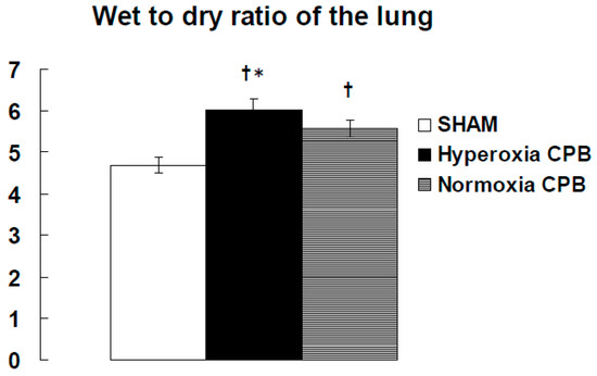 The wet-to-dry weight (W/D) ratio of the lung at the end of experiment [25]. † p < 0.05 versus the SHAM group, * p < 0.05 versus the Normoxia CPB group.