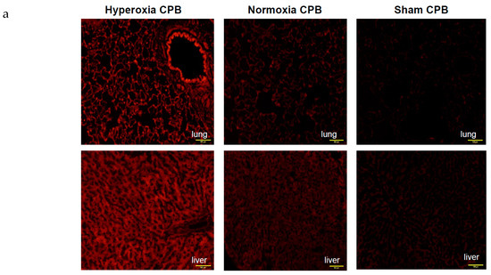 In the hyperoxia CPB group, the levels of LDH, AST, and ALT increased significantly 60 min after CPB initiation and increased further at the end of CPB. On the other hand, in the normoxia CPB group, the elevated levels of organ damage enzymes were significantly suppressed by approximately 50% at the end of CPB compared to the hyperoxia CPB group (Figure 3d–f). Neither AST nor ALT levels changed significantly during CPB from the pre-CPB levels in the normoxia group. The CPB groups showed significantly higher W/D ratios than the SHAM group (Figure 4). Although, the increase in the W/D ratio was significantly suppressed in the normoxia CPB group compared to the hyperoxia CPB group. DHE staining in the lung and liver tissues was strikingly enhanced in the hyperoxia CPB compared to the normoxia CPB group (Figure 5a,b), this data suggesting greater superoxide production with a hyperoxia condition management during CPB.
