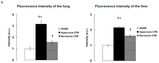 Detection of superoxide production in liver and lung tissues. (a) Representative examples of in situ detection of superoxide in each group’s lung and liver. Confocal microscope sections of organ are labeled with the fluorescent oxidative dye dihydroethidium [25]. Scale bar: 100 μm. (b) Mean fluorescence intensity after deducting the values of SHAM. † p < 0.05 versus SHAM group, * p < 0.05 versus Normoxia CPB group [15]. a.u.: arbitrary units.