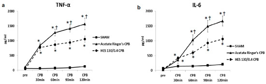 Plasma TNF-α (a) and IL-6 (b) [35]. * p < 0.05 versus the SHAM group, † p < 0.05 versus the HES 130/0.4 CPB group at the same point in time.