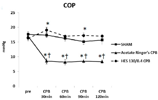 Colloid osmotic pressure (COP) during the experiment [35]. * p < 0.05 versus the SHAM group, † p < 0.05 versus the HES 130/0.4 CPB group at the same point in time.