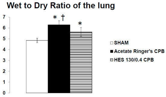 The wet-to-dry ratio of the lung at the end of experiment [35]. * p < 0.05 versus the SHAM group, † p < 0.05 versus the HES 130/0.4 CPB group.