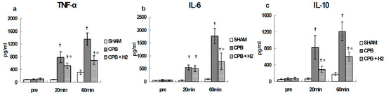 Plasma TNF-α (a), IL-6 (b), and IL-10 (c) [24]. † p < 0.05 versus the SHAM group, * p < 0.05 versus the CPB group at the same point in time.