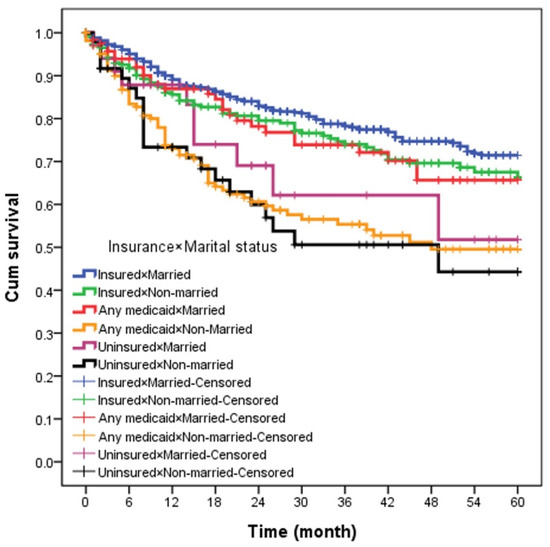 This study had some limitations. First, this study used the SEER database, which provided information on insurance and marital status only at the time of diagnosis or initial treatment. The status of either could change during treatment and follow up. We also did not know the economic status or quality of marriage from the database. Although the patients were married, they could still live apart, and unmarried patients could still have a partner or other living companion. Second, the SEER database does not provide the details of treatment, including chemotherapy regimen and radiotherapy technique. These important factors may affect outcomes in patients. Third, we did not take comorbidities into account, which could also affect the intensity of treatment and consequently treatment outcomes. Finally, owning to the small sample size, although we realize that insurance eligibility policies are not uniform across states, we did not account for these varying policies. We also did not stratify the unmarried into groups of widowed, never married, and divorced. Further studies are needed to elucidate the association between survival and different types of unmarried status and insurance status.