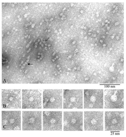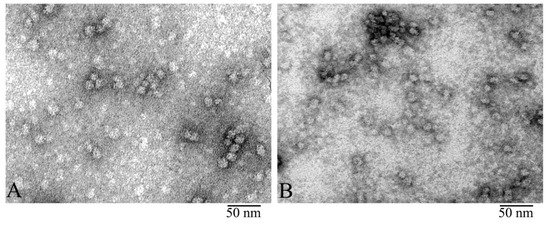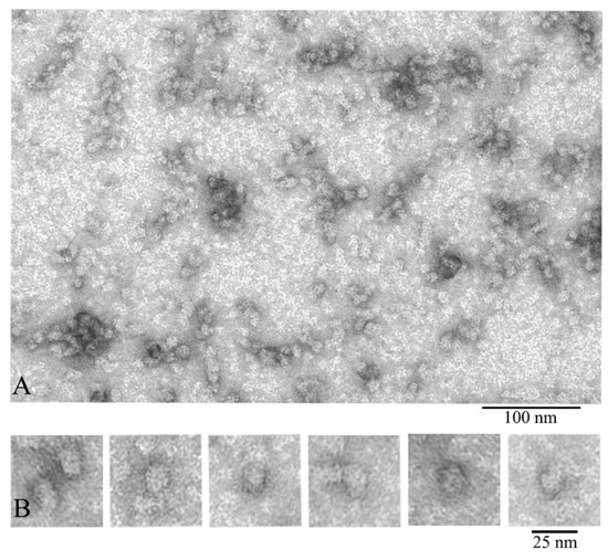 In the preparation field (Figure 2A), some distinct complexes of α-crystallin are seen, their diameters vary, and they are stained differently by the uranyl acetate. The particles with a diameter of about 12–14 nm are stained most intensively, which is an indirect evidence that their homogeneity and compactness are higher. It is also visible that the larger the particle’s diameter, the lighter it is stained. This may be indicative of lower compactness and orderliness of the larger oligomers and/or their lower height. Heterogeneity of the oligomer complexes of α-crystallin was demonstrated in the set of individual particles in Figure 2B. It can be easily seen that some oligomers are assembled into aggregates (the open arrow in the center of Figure 2A) while others interact with each other, forming some elongated particles (the closed arrow). Analogous aggregates have been mentioned earlier [27,41]. In aggregates, the particles have a diameter of about 11–12 nm, which is smaller than the average diameter of 12–14 nm. This might have been an artifact of the staining of higher-order complexes with uranyl acetate and/or of possible compactization of complexes upon their interaction. It should be noted that a great number of small particles of different dimensions can be seen; they are poorly stained and consequently were not analyzed. For comparison, one can see EM data for the recombinant αB-crystallin from bovine eye lens (Figure S2).