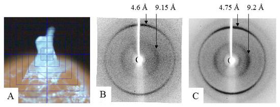X-ray diffraction: (A) preparation rod of α-crystallin from bovine eye lens; (B) α-crystallin from bovine eye lens (nucleus); and (C) amyloidogenic fragment of protein Bgl2 from yeast cell wall [49].