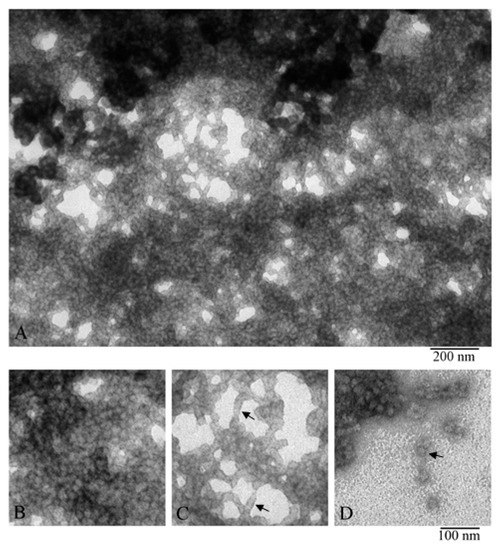 EM images of α-crystallin gel (nucleus). Fragments of the fields of α-crystallin gel: (A,B) field fragments with tight packing of heterogeneous oligomer complexes; (C) field fragment with lower density of α-crystallin complexes, arrows show short stacks of complexes; and (D) field fragment with single complexes (shown by the arrow).
