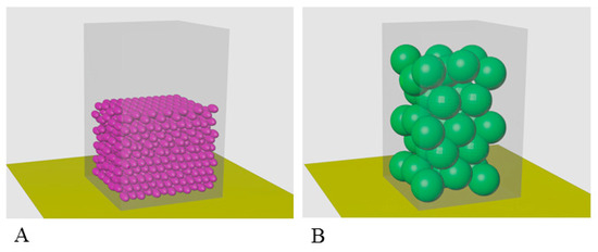 Model for filling the same volume with particles of α-crystallin of different sizes at the concentration of about 500 mg/mL: (A) monomeric α-crystallin; (B) α-crystallin complex. The calculation of the filling of the same volume with particles of different sizes shows that, at C = 500 mg/mL, the monomers will occupy about 0.45V (A) and that the complexes will occupy 0.83V (B). When the concentration of α-crystallin is up to 1000 mg/mL (as in some fish), α-crystallin in the form of complexes will take 1.66V, i.e., particles will not fit in the cell. Taking into account the fact that, in addition to α-crystallin, in the fibrous cells of the eye lens, there are β-, γ-crystallins and a number of other cellular proteins of the cytoskeleton, the existence of α-crystallin in the form of complexes is problematic.