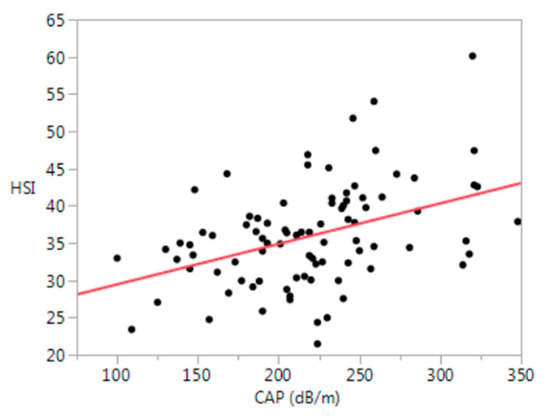 Hepatic steatosis by the HSI (>41) was present in 24% of participants and strongly correlated with CAP (≥263 db/m) (r = 0.41, p < 0.0001) (Figure 2).