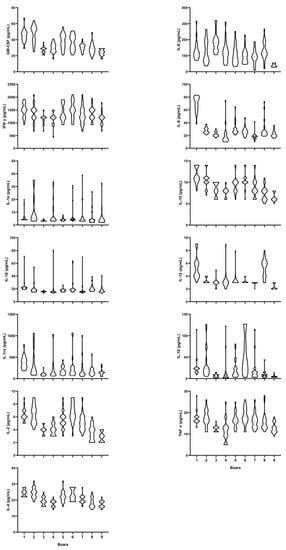 The first result of the present study verified the variability between males (inter-male) in the SP concentration of all measured cytokines, already known in pigs [19] and in males of other mammalian species such as humans [18]. Such inter-male variability opens up the possibility of using the SP concentration of some cytokines as a diagnostic tool for some male reproductive disorders [29,30,31], ejaculate parameters [16,32], and even to predict the ability of spermatozoa to withstand some biotechnological procedures, such as cryopreservation [33]. However, the results of the present study, demonstrating a substantially higher intra-male variability than inter-male variability, weaken the practical usefulness of SP-cytokine concentrations as a diagnostic tool. The existence of intra-male differences in other bioactive SP components has been previously documented in pigs, being particularly noticeable for total and specific protein concentrations [34] and for components with antioxidant properties, such as glutathione peroxidase [35] or melatonin [36]. Similarly, fluctuations in SP-cytokine concentrations over time were reported in healthy men [18,37]. The causes for these fluctuations have not been explained.