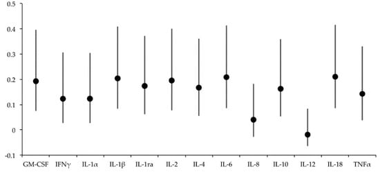 Intraclass correlation coefficient (ICC 3,1) values in terms of single measures (dot) and 95% confidence intervals (bars) of cytokine concentrations in 180 boar seminal plasma samples. Cytokines: granulocyte-macrophage colony-stimulating factor (GM-CSF), interferon-gamma (IFNγ), interleukin (IL)-1α, IL-1β, IL-1ra, IL-2, IL-4, IL-6, IL-8, IL-10, IL-12, IL-18, and tumor necrosis factor-α (TNFα).