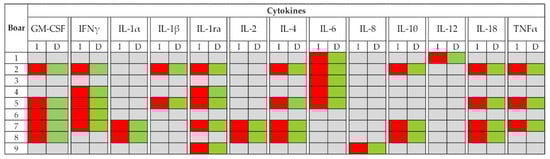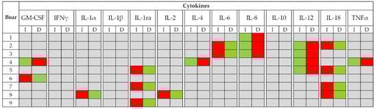 Variation pattern in the total amount of seminal plasma cytokines in ejaculates collected from nine boars (20 ejaculates per boar) during the periods of increasing (I, January to June) or decreasing daylight/temperature (D, July to December). Grey box indicates no differences between periods, while red and green boxes indicate a relationship between dominating seasonal parameters with high and low total cytokine amounts (p < 0.05), respectively. Cytokines: Granulocyte macrophage colony-stimulating factor (GM-CSF), interferon-gamma (IFNγ), interleukin (IL)-1α, IL-1β, IL-1ra, IL-2, IL-4, IL-6, IL-8, IL-10, IL-12, IL-18, and tumor necrosis factor-α (TNFα).