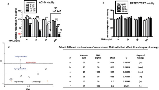 3.1. Combination Treatment of Curcumin and TRAIL Increases Cell Death in the Cancerous Renal ACHN Cells without Affecting the Normal Epithelial RPTEC/TERT1 Cells