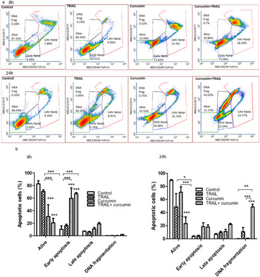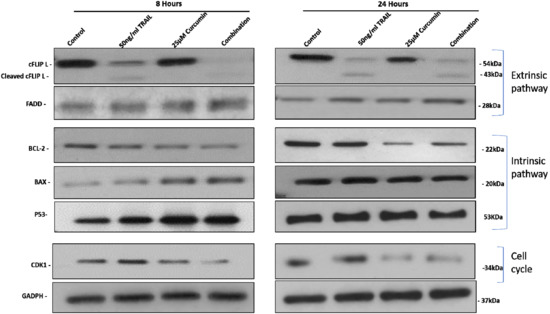 3.5. The Effect of Curcumin, TRAIL, and Curcumin/TRAIL Combination on Pro- and Anti-Apoptotic PROTEIN Expression