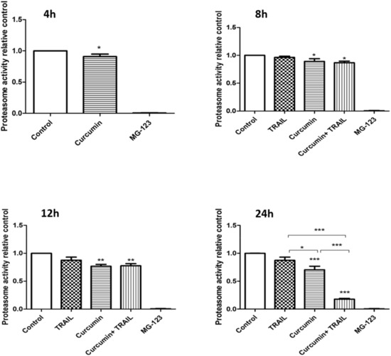3.6. Curcumin, Alone or in a Combination with TRAIL, Inhibited Proteasome Activity