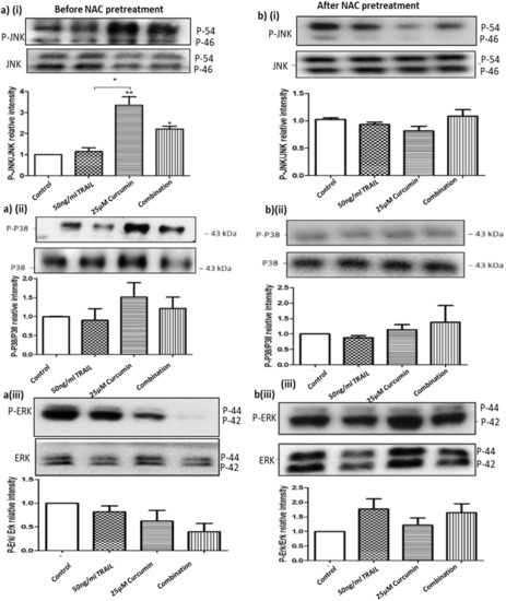 3.10. ROS Regulates Curcumin or Curcumin/TRAIL Combination-Induced MAPK Dysregulation