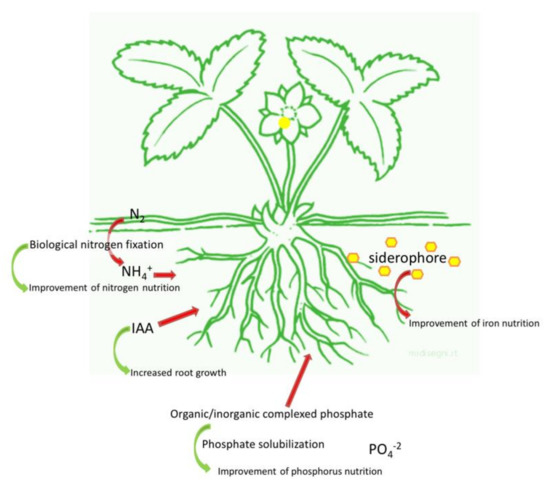 The mechanisms at the base of the positive effects on plant growth induced by strains of these two genera are not limited to N fixation. Azospirillum strains synthesize phytohormones (IAA, gibberellins, and cytokinin) and modulate root development and uptake of plant nutrients (N, P, and K). Similarly, Azotobacter releases vitamin B complex, different phytohormones such as gibberellins, naphthalene acetic acid, and other substances involved in biocontrol of root pathogens and promoting root growth and mineral uptake [44].