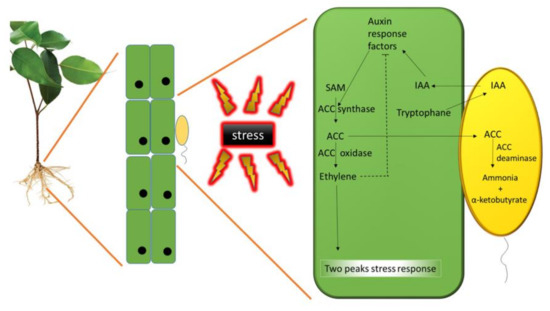 The amino acid tryptophan is exuded by plant cells, taken up by PGPB living around the roots, and used to synthesize IAA. This bacterial IAA is taken up by the plant cells and, together with the plant’s endogenous pool of IAA, stimulates an auxin signal transduction pathway which results in cell growth and proliferation, and in increased transcription of the gene for ACC synthase, eventually yielding an increased concentration of ACC. As a consequence, ACC is synthesized on SAM as substrate favoring the production of ethylene and leading to a two peaks plant stress response. The newly produced ACC is partly exuded from plant roots, taken up by the bacteria, and converted by ACC deaminase to ammonia and α-ketobutyrate. As a result, the amount of ethylene produced by the plant is reduced. Alleviation or exacerbation of stress depends on the plant species, its age, and the nature of the stress itself [100]. The answer of the plant to environmental stress involving ethylene has been explained by Glick et al. [101]. In this model, a few hours after the onset of a stress, an initial small peak of ethylene rises. This peak is considered to be beneficial since it triggers a protective response by the plant, such as the transcription of pathogenesis-related genes and induction of acquired resistance [100,102]. When the stress become chronic or more intense, the transcription of the ACC synthase genes occurs some days later, and another ACC is synthesized leading to a second, much larger ethylene peak. This second peak induces processes such as senescence, chlorosis, and abscission; therefore, the growth and the survival of the plant are hampered. A fraction of the ACC synthesized by this two-step process is released from seeds or plant roots, taken up by the bacteria, and converted to ammonia and α-ketobutyrate by the enzyme ACC deaminase [103]. As a consequence, the amount of ethylene produced by the plant after the stress is reduced and does not reach inhibitory levels. Various environmental stresses can also either increase the synthesis of IAA or stimulate the transcription of the gene for ACC synthase. As the amount of ethylene in a plant increases, the transcription of auxin response factors is inhibited. In the absence of bacterial ACC deaminase, by limiting transcription of auxin response factors, ethylene hampers both cell growth and IAA stimulation of the synthesis of additional ethylene. In the presence of bacterial ACC deaminase, less ethylene is formed because some of the ACC is degraded by ACC deaminase. When ACC deaminase is synthesized, transcription of auxin response factors is not suppressed, and IAA can stimulate cell growth and proliferation without inducing a rise of the ethylene level. In this model, ACC deaminase both decreases ethylene inhibition of plant growth and allows IAA to boost plant growth, both in the presence and absence of plant stress (Figure 2). Therefore, plants hosting bacteria able to synthesize ACC deaminase and exposed to stressful conditions result to be more tolerant to stress and their growth is comparable to that of plants grown in normal conditions. In the same way, bacteria synthesizing this enzyme favor the establishment of symbiosis with rhizobia (with an increased nodulation) [104,105,106] or mycorrhizal fungi [107,108,109], thus indirectly improving both plant growth and health.
