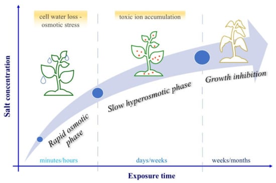 The above mentioned effects of salt stress on plants largely depend on the concentration of salt in soil, on the exposure time to stress (that can vary between minutes/days to days/weeks/months) [6,155] and on the plant’s ability to absorb salt before it becomes highly toxic, strongly affecting metabolic function and plant life itself [6]. An increase of salinity in soil leads cells, in a few minutes, to lose water due to osmotic stress: this phenomenon, known as “rapid osmotic phase” is followed by a “slower (days/weeks) ion toxicity phase” (or “hyperosmotic stress phase”) (Figure 3), that is characterized by a high accumulation of toxic ions, decreasing both cell division and expansion rate [6,156]. Therefore, over time (weeks/months), the vegetative development of the different plant organs is strongly altered.