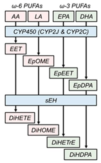 - Hashimoto, K. Role of Soluble Epoxide Hydrolase in Metabolism of PUFAs in Psychiatric and Neurological Disorders. Front. Pharmacol. 2019, 10, 36. [Google Scholar] [CrossRef] [PubMed]