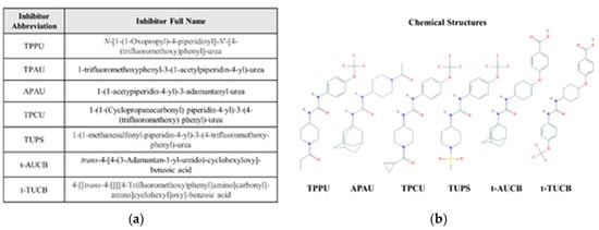 Commonly used soluble epoxide hydrolase inhibitors. (a) Abbreviations and full chemical names for commonly used inhibitors. (b) Chemical structures for representative inhibitors. Chemical structures were downloaded from the public PubChem database (pubchem.ncbi.nlm.nih.gov).