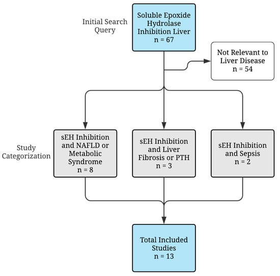To provide a comprehensive review of the use of sEH inhibition in liver diseases, the PubMed database (https://www.ncbi.nlm.nih.gov/pmc/) was searched for key literature sources (those listed in Table 1) up to 1 May 2020 using a combination of medical subject heading terms and text keywords “soluble epoxide hydrolase inhibition liver” or “sEH inhibition liver”. All studies were screened individually by title and abstract, and studies that did not pertain to the liver disease were excluded. Date of publication, model organism, or sEHI used were not used to exclude liver studies. Our initial search yielded 67 studies, 54 of which were excluded for lack of relevance to liver disease. The remaining 13 studies were categorized by liver disease subtype (i.e., NAFLD/metabolic syndrome, fibrosis/PTH, and sepsis). Figure 3 describes the literature search strategy.