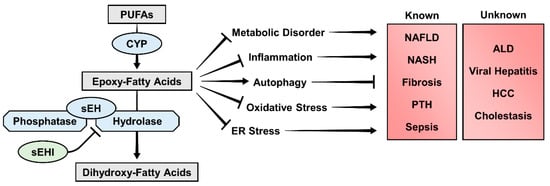 While the initial discovery of epoxide hydrolases occurred approximately fifty years ago, the pathogenic role of sEH in liver diseases has been defined only recently. Clearly, sEH inhibition is an attractive therapeutic option in a spectrum of liver diseases, but future research in some key areas is needed to further elucidate its applications, limitations, and molecular mechanisms. One area that should be addressed is sex-specific responses to sEH inhibition in liver diseases. None of the studies reviewed here included female animals, despite the well-known sexual dimorphism of some liver diseases such as NAFLD in both humans and rodents [89]. Importantly, evidence suggests that estrogens can downregulate sEH expression, meaning females may have higher baseline epFA levels, affording some protection against liver disease, although no studies have addressed this question directly [90,91,92]. Future research should also address the efficacy of sEH inhibition in additional liver diseases like ALD, viral hepatitis, cholestatic liver disease, and HCC. These diseases share some characteristics with the liver diseases reviewed here (e.g., chronic inflammation, oxidative stress, and ER stress), characteristics which epFA preservation may attenuate [93,94,95]. Next, the pool of epFAs is quite a large one. However, the role and underlying mechanisms of only a few have been investigated so far. Future research should incorporate additional epoxides from multiple PUFAs to elucidate key mediators of liver diseases and to better understand whether omega-3 PUFAs truly do give rise to more beneficial epoxides than omega-6 PUFAs. Another important area to consider is that sEH is a dual-function enzyme with two bioactive domains—a C-terminal hydrolase domain (which sEHIs target) and an N-terminal phosphatase domain. While the hydrolase domain is well studied, the phosphatase domain is not, meaning that its potential contribution to liver pathology is unknown. Future studies should consider that the phosphatase activity remains active even after addition of sEHIs but is inactivated by genetic sEH deletion: this may help elucidate any differences in phenotype between sEHI-treated animals and Ephx2−/− animals.