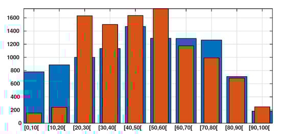 In this figure we plot in blue bars the age distribution of the Japanese population for 10,000 people and we plot in orange bars the age distribution of the number of reported cases of SARS-CoV-2 for 10,000 patient on 29 April (based on the total of 13,660 reported cases). We observe that of the confirmed patients belong to the 20–60 years age class.