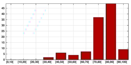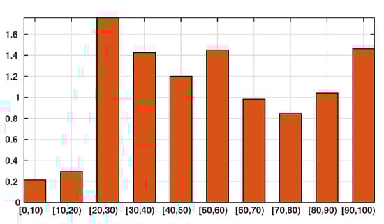 In this figure we plot the number of infected patients for each age class per 10,000 individuals of the same age class (i.e., the number of infected individuals divided by the population of the age class times 10,000). The figure shows that the individuals are more or less likely to becomes infected depending on their age class. The bars describe the susceptibility of people to the SARS-CoV-2 depending on their age class.