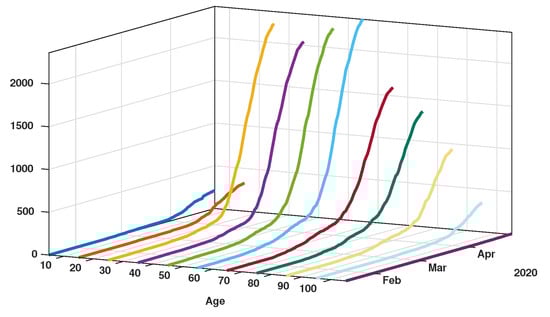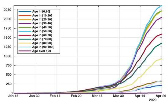 Patient data in Japan have been made public since the early stages of the epidemic with the quarantine of the Diamond Princess in the Haven of Yokohama. We used data from the website covid19japan.com (https://covid19japan.com. Accessed 6 May 2020) which is based on reports from national and regional authorities. Patients are labeled “confirmed” when tested positive to COVID-19 by PCR. Interestingly, the age class of the patient is provided for 13,660 out of 13,970 confirmed patients (97.8% of the confirmed population) as of 29 April. The age distribution of the infected population is represented in Figure 1 compared to the total population per age class (data from the Statistics Bureau of Japan estimate for 1 October 2019). In Figure 2 we plot the number of reported cases per 10,000 people of the same age class (i.e., the number of infected patients divided by the population of the age class times 10,000). Both datasets are given in Table 1 and a statistical summary is provided by Table 2. Note that the high proportion of 20–60 years old confirmed patients may indicate that the severity of the disease is lower for those age classes than for older patients, and therefore the disease transmits more easily in those age classes because of a higher number of asymptomatic individuals. Elderly infected individuals might transmit less because they are identified more easily. The cumulative number of death (Figure 3) is another argument in favor of this explanation. We also reconstructed the time evolution of the reported cases in Figure 4 and Figure 5. Note that the steepest curves precisely concern the 20–60-year old, probably because they are economically active and therefore have a high contact rate with the population.