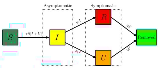 Here is time in days, is the starting date of the epidemic in the model, is the number of individuals susceptible to infection at time t, is the number of asymptomatic infectious individuals at time t, is the number of reported symptomatic infectious individuals at time t, and is the number of unreported symptomatic infectious individuals at time t. A flow chart of the model is presented in Figure 6.