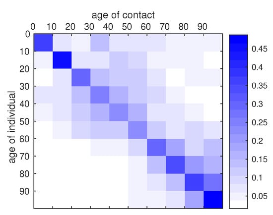 where the ith line of the matrix is the average number of contact made by an individuals in the age class i with an individual in the age class j during one day. Notice that the higher number of contacts are achieved within the same age class. The matrix of conditional probability of contact between age classes is given by (18) and we plot a visual representation of this matrix in Figure 7.