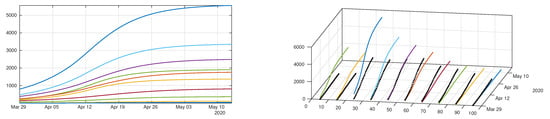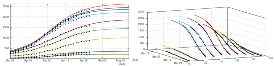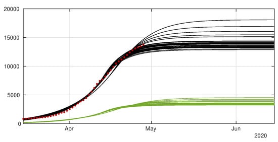 In Figure 11 we plot the cumulative number of reported cases as given by our model (12)–(15) (solid lines), compared with reported cases data (black dots). We used the method described in the Appendix A to estimate the parameters from the data. In Figure 12 we plot the cumulative number of unreported cases (solid lines) as given by our model with the same parameter values, compared to the existing data of reported cases (black dots).