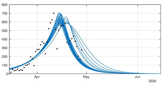 Daily number of cases. We plot the daily data (black dots) with (blue curve). We fix , days and and we apply the method described in Liu et al. [29]. The best fit is 2 April, 5 April, 27 April, , , , and 13 January.