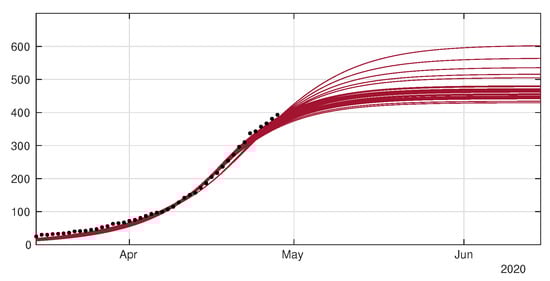 In the Figure A2 below, we present an example of application of our method to fit the Japanese data. We use the period going from 20 March to 15 April.