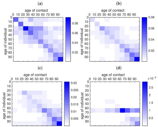 Rate of contact between age classes according to the fitted data. For each age class in the y-axis we plot the rate of contacts between one individual of this age class and another individual of the age class indicated on the x-axis. (a) is the rate of contacts before the start of public measures (11 April). (b) is the rate of contacts at the date of effect of the public measures for the last age class (16 April). (c) is the rate of contacts one week later (23 April). (d) is the rate of contacts one month later (16 May). In this figure we use , , , , , , , , and , , , , , , , and , , .