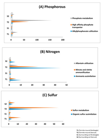 To answer if each environment had distinguished archaeal communities, a principal component analysis (PCA) was plotted. Our PCA analysis showed, for example, that Cenarchaeum, Methanosphaerula, and Methanosarcina predominated the termite mound soil (T2), while Candidatus Nitrososphaera, Nitrosopumilus, and Haloferax predominated the surrounding soil (S2) (Figure S1). The discrepancies in the archaeal domination in both habitats might also influence the ecological roles played by these archaea. Archaea have the ability to recycle soil nutrients like nitrogen in environments [31]. Furthermore, methane-oxidizing archaea like Methanosarcina (which was predominant in T2) can act as biofilter [32,33] and reduce the amount of methane finally released to the surroundings [32]. This could be the reason why the phosphorus (phosphate metabolism, alkylphosphonate, and high-affinity phosphate transporter), nitrogen (ammonia assimilation, nitrate and nitrite ammonification, and allantoin utilization), and sulfur (organic sulfur assimilation and sulfur metabolism) pathways were all significantly more predominant in termite mound soils than in their comparative surrounding soils (Figure 3).