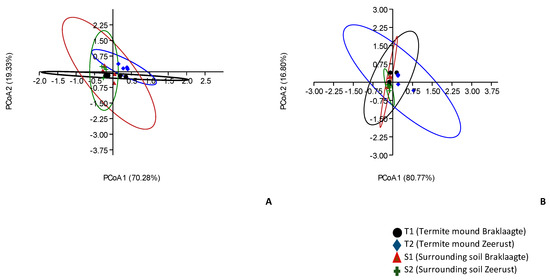 Principal coordinates analysis (PCoA) of (A) archaeal taxonomic composition and (B) functional categories of termite mound soils and their surrounding soils.