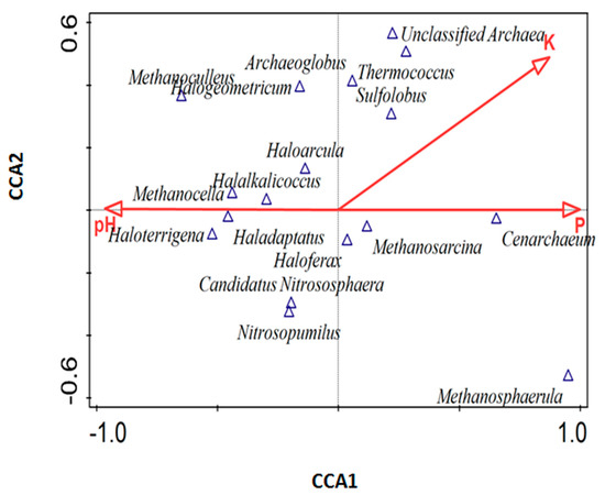 To determine the effect of soil properties on the archaeal community distribution, a canonical correspondence analysis (CCA) was used (Figure 5). All the soil physical and chemical properties in Table 1 were used for the CCA plot (Figure 5). The canonical correspondence analysis (CCA) plot (Figure 5) indicated that the composition of the archaeal communities was likely dependent on the soil properties. The vector length of K (on the axis 1) positively correlated with Thermococcus and Sulfolobus. On axis 2, the vector length of P positively correlated with Cenarchaeum, Methanosarcina, and Methanosphaerula, but negatively correlated with Haloterrigena.