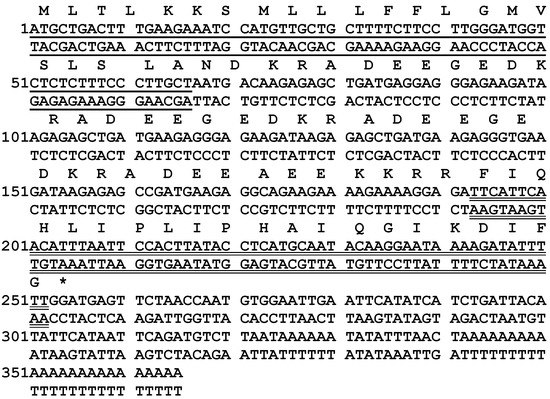 Nucleotide and translated open-reading frame amino acid sequence of the biosynthetic precursor-encoding DNA of kassinatuerin-3. The putative signal peptide sequence is single-underlined, and the mature peptide sequence is double-underlined. The stop codon is indicated by an asterisk (*).