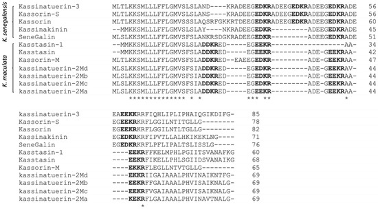 The alignment of the amino acid sequences of the biosynthetic precursors of bioactive peptides discovered in the skin secretions of K. senegalensis and K. maculata. Identical amino acids are indicated by asterisks (*). The acidic/basic tetrapeptide motif is indicated in bold typeface.