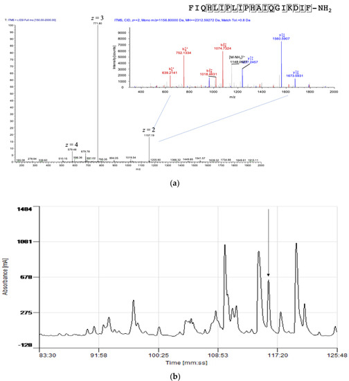 To determine the presence of kassinatuerin-3 in the skin secretion of K. senegalensis, the dissolved skin secretion was subjected to RP–HPLC and LC–MS/MS analysis. The MS/MS spectra were searched against the cDNA precursor of kassinatuerin-3 and this proved the presence of kassinatuerin-3 in the skin secretion as well as the C-terminal amidation of the mature peptide (Figure 3a). The observed molecular mass of kassinatuerin-3 was 2311.59 Da, which was consistent with that of the predicted mature peptide (2311.346 Da (mono.)) from the cDNA precursor. In the RP–HPLC chromatogram, the retention time of kassinatuerin-3 was around 116 min (Figure 3b). The fraction of the single peak indicated in the chromatogram was collected and exhibited antimicrobial activity via a screening test (data not shown). Therefore, we decided to chemically synthesize the peptide for further investigation.