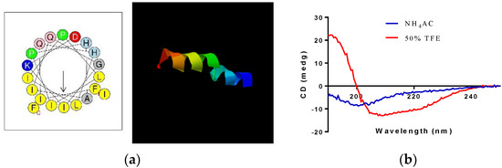 (a) Helical wheel diagram and 3D model of kassinatuerin-3 predicted by I-TASSER. (b) Circular dichroism (CD) spectra of 50 µM kassinatuerin-3 in aqueous solution (10 mM NH4AC) and membrane-mimicking solution (50% (v/v) trifluoroethanol (TFE)/10 mM NH4AC).