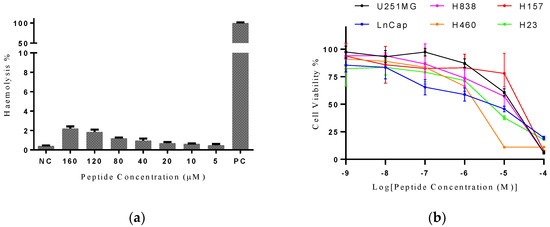 Kassinatuerin-3 produced no detectable hemolysis activity up to a concentration of 160 μM, above which there was slight activity (Figure 5a). The peptide was then assessed for possible anti-proliferative effects on a range of cancer cell lines. Six different cell lines were employed in the cell viability assays, with three cell lines (H23, H157, H838 and H460) representing human non-small cell lung cancers, LNCaP representing a human prostate cancer and U251MG was from a glioma. The peptide displayed significant dose-dependent anti-proliferative activity against all the cell lines employed in the study (Figure 5b), with IC50s showed in Table S1.