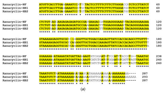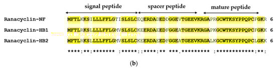 (a) Alignment of precursor cDNA nucleotides of RNF, ranacyclin-HB1 and ranacyclin-HB2; and (b) alignment of precursor cDNA translated peptides of RNF, ranacyclin-HB1 and ranacyclin-HB2. Asterisks indicate identical nucleotides/amino acids (in (a,b)) and colons (:) indicate chemically-conserved amino acids (in (b)).