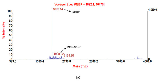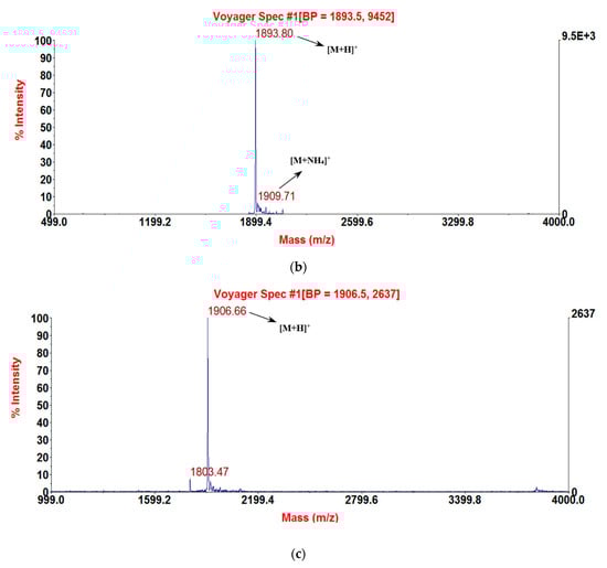 MALDI-TOF MS spectra of the three purified synthetic peptides: (a) RNF (1892.69 [M + H]+); (b) RNF1 (1893.8 [M + H]+); and (c) RNF3L (1906.66 [M + H]+).